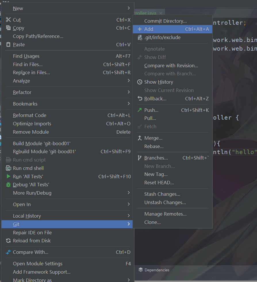 选择项目右键,选择git中的add,将代码放置在缓存区中