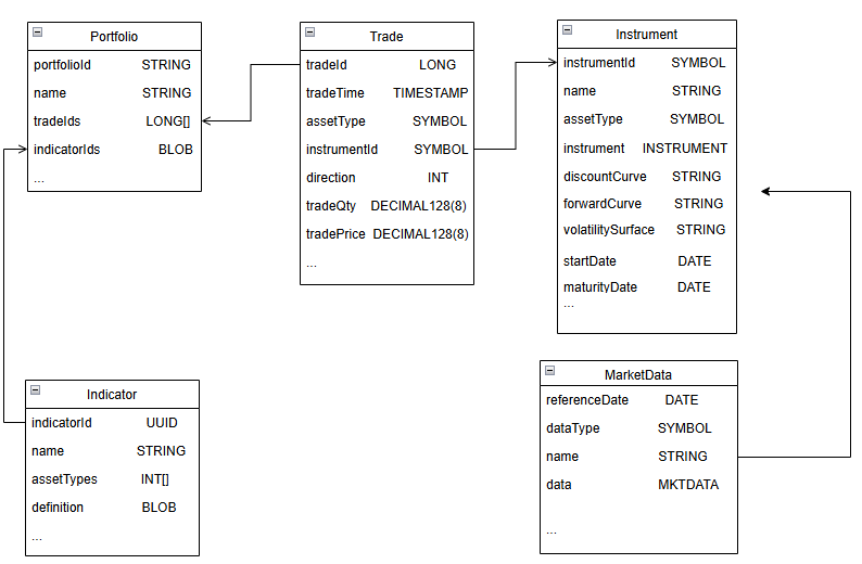 • Instrument:金融工具表,用于存储金融工具的基本信息。其中 instrumentId 为 unique 的,对于标准型金融工具,一个 id 可以对应多笔交易;对于非标准型金融工具,一个 id 只能对应一笔交易。金融工具的基本信息,包括定价需要用到的市场数据(Curve/Surface)名称可以解析后放到 instrument 字段中,也可以放在外面, 方便定价时与 MarketData 表关联 。