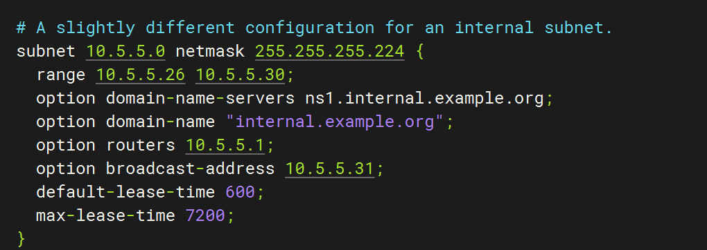 subnet 10.5.5.0 netmask 255.255.255.224 { ##定义分配的网段和子网掩码