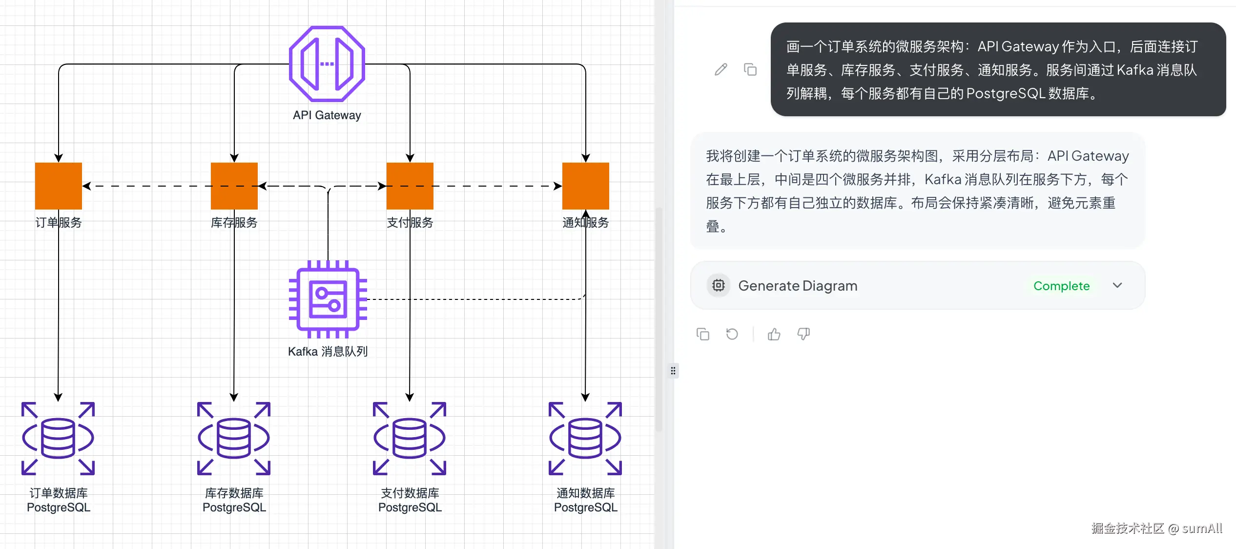 "画一个订单系统的微服务架构:API Gateway 作为入口,后面连接订单服务、库存服务、支付服务、通知服务。服务间通过 Kafka 消息队列解耦,每个服务都有自己的 PostgreSQL 数据库。"