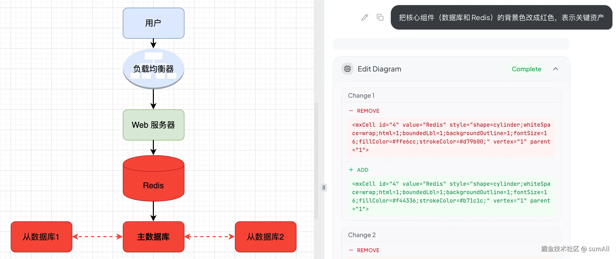 - "把核心组件(数据库和 Redis)的背景色改成红色,表示关键资产"