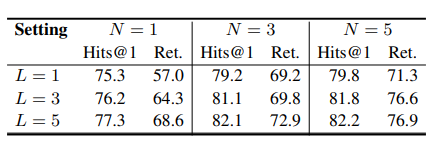 超参数分析: 增加搜索宽度 N 和最大长度 L 均能带来性能提升。当 N 从 3 降到 1 时,性能显著下降(例如 L=3 时,Hits@1 从 81.1% 降至 76.2%),表明 N(即搜索宽度)对框架性能至关重要。
