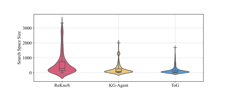 超关系分析: ReKnoS 具有明显更大的搜索空间。在GrailQA上,其平均搜索空间大小(即搜索过程中遇到的事实三元组数量)比 KG-Agent 和 ToG 分别高出 42% 和 55%。这使得ReKnoS更有可能检索到正确的答案三元组。