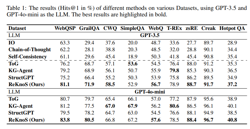 - 性能对比: ReKnoS 在大多数数据集上均优于所有基线,尤其是在需要复杂推理的数据集上(如GrailQA和CWQ) 。例如,在GrailQA上,使用GPT-3.5时,ReKnoS (71.9%) 优于 KG-Agent (68.9%);使用GPT-40-mini时,ReKnoS (80.5%) 优于 KG-Agent (77.5%) 。