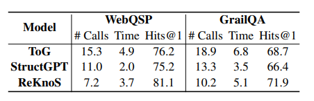 )。而 ReKnoS 在每一步中,LLM 评估的超关系数量最多为 N(即候选集大小),与深度无关,显著减少了LLM的调用次数。