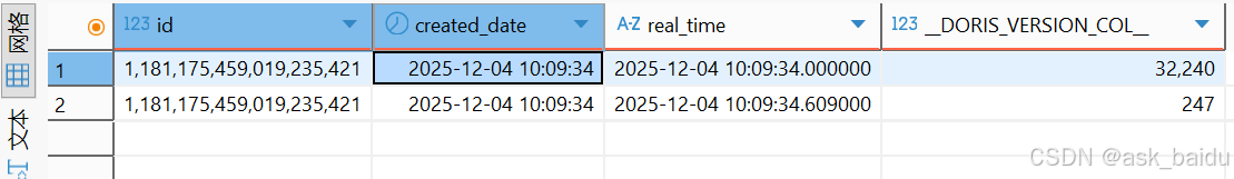 结论:如上有图,虽然created_date看起来一样,实际毫秒不一样,版本号不一样,doris会当作两条数据存储
