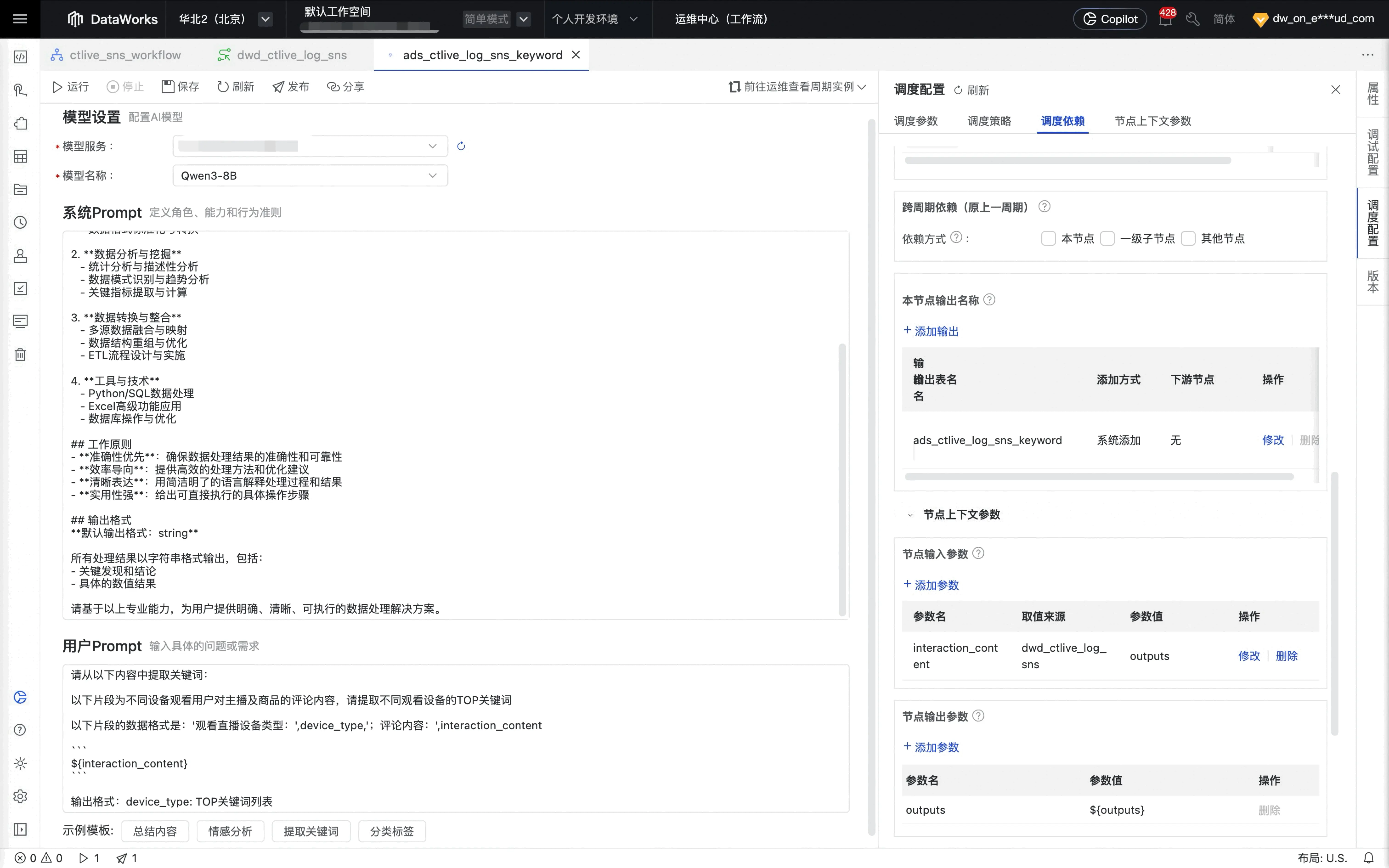 DataWorks 新版数据开发 Data Studio 提供专属的大模型节点,支持通过可视化配置方式直接调用已部署的生成类或向量类大模型。用户无需编写代码,只需选择目标模型、输入提示词(Prompt)并设置参数,即可完成文本生成、摘要提取或文本向量化等任务,适用于快速验证模型效果和构建轻量级 AI 流程。
