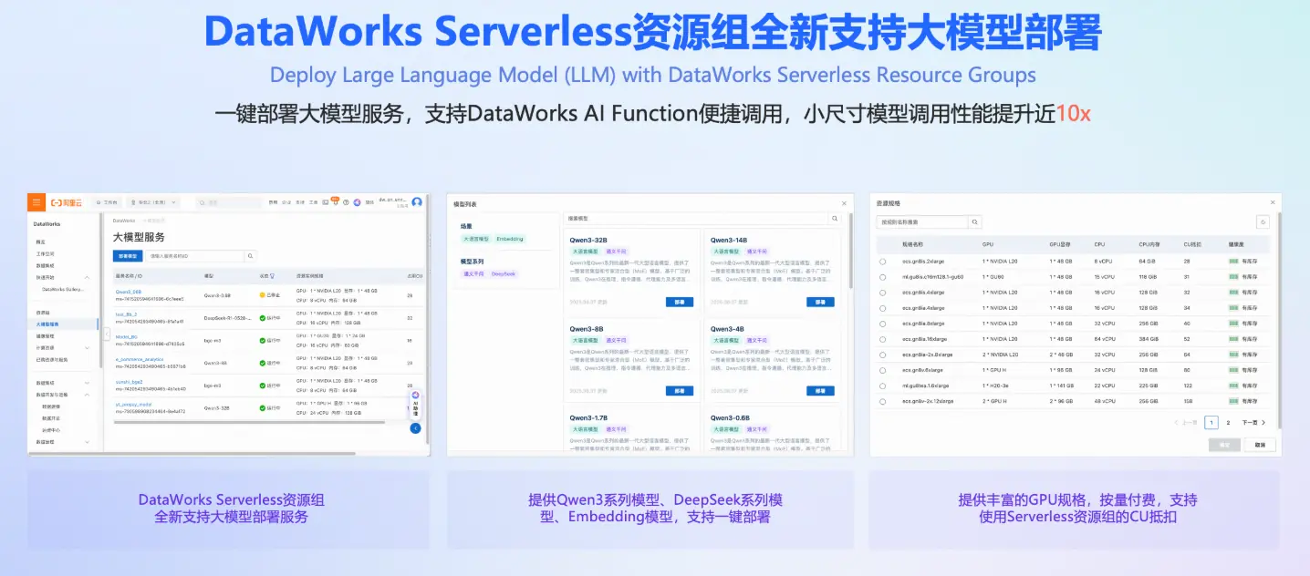 现在,阿里云 DataWorks 发布大模型服务能力 ,基于 Serverless 资源组 ,支持用户 一键部署主流大模型 ,并可在 数据集成和数据开发任务中直接调用模型 API,实现"部署---集成---使用"全流程闭环,真正让数据工程师也能轻松玩转大模型!