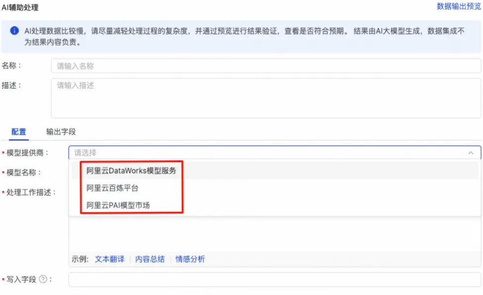 在单表离线同步任务中,可使用大模型服务对同步中的数据进行AI辅助处理。