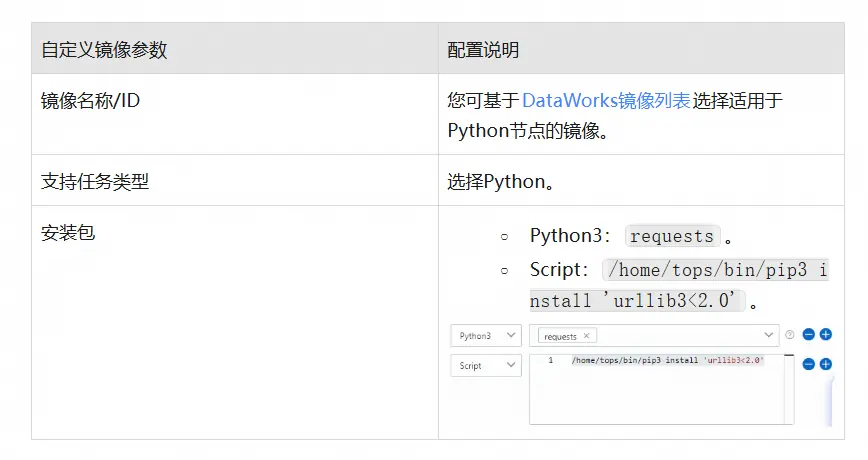 requests库,请参考以下主要参数,基于DataWorks官方镜像创建自定义镜像安装该依赖环境。