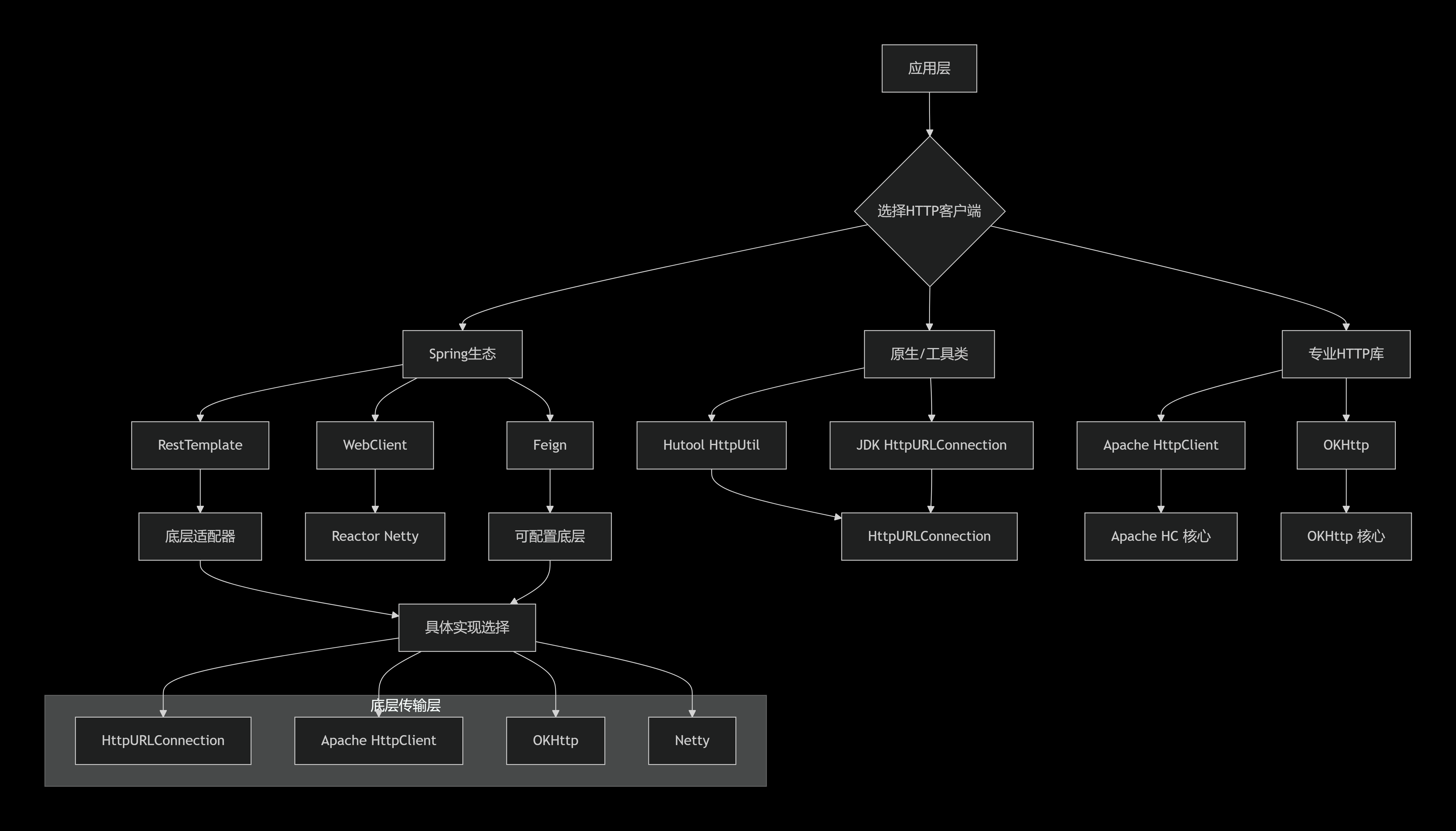 我来详细解析这几种HTTP客户端的关系、底层实现和架构差异。这是理解Java HTTP生态的关键。