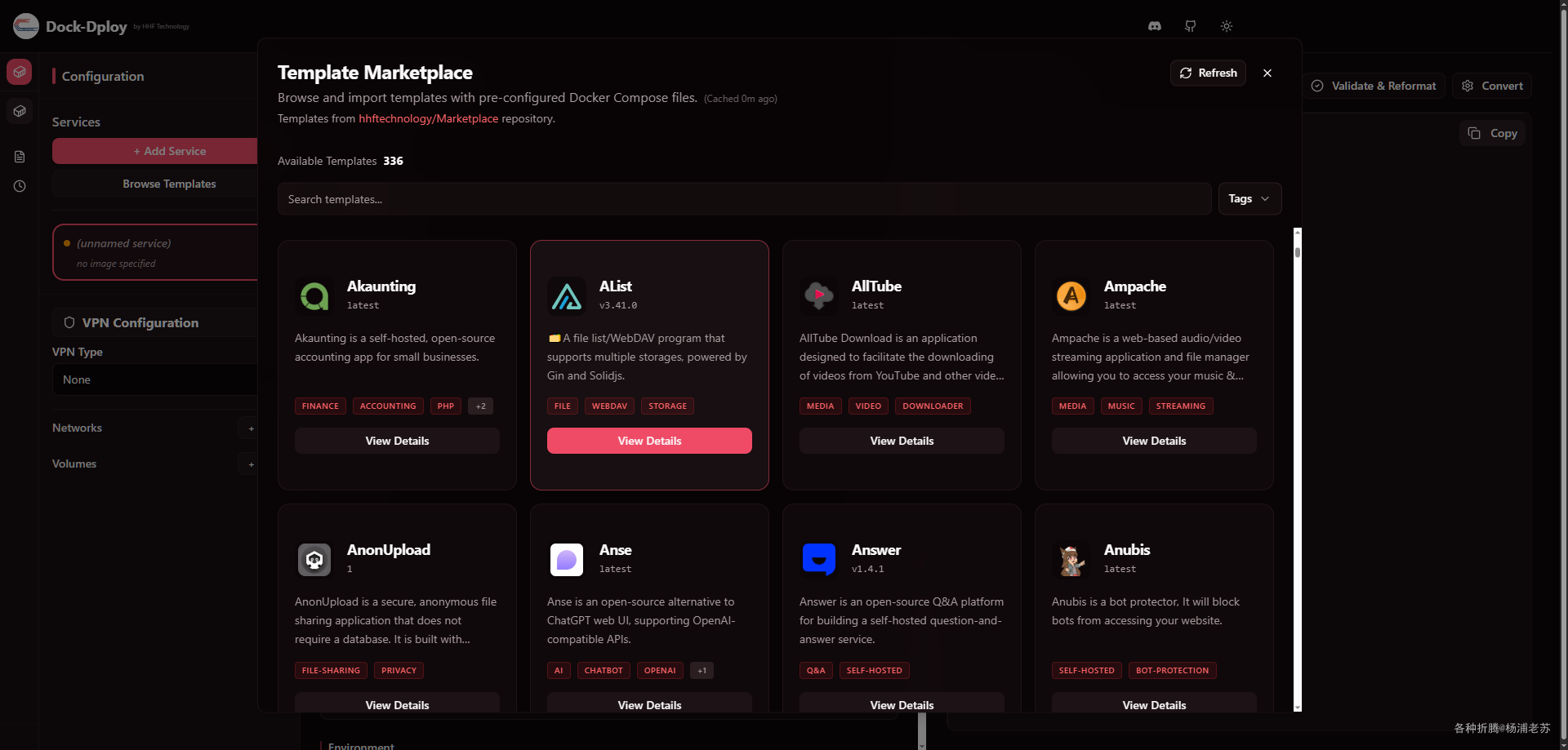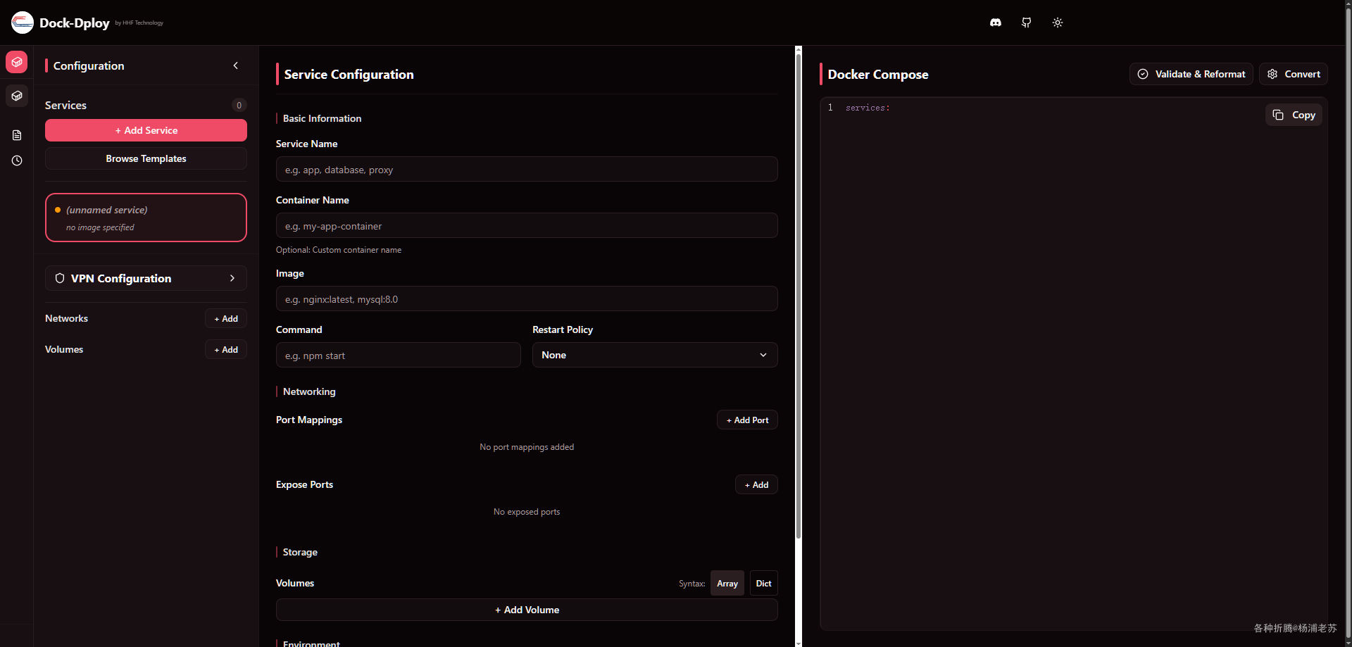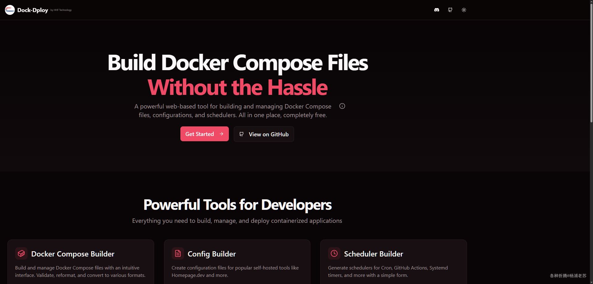 Dock-Dploy是一个基于web的工具,专为构建、管理和转换Docker Compose文件、配置文件和调度程序而设计。它提供了直观的界面,让用户可以轻松创建和配置Docker服务。