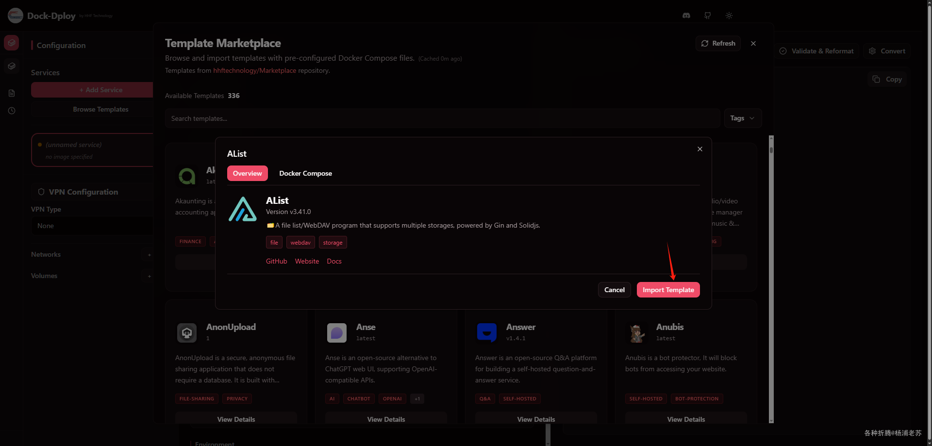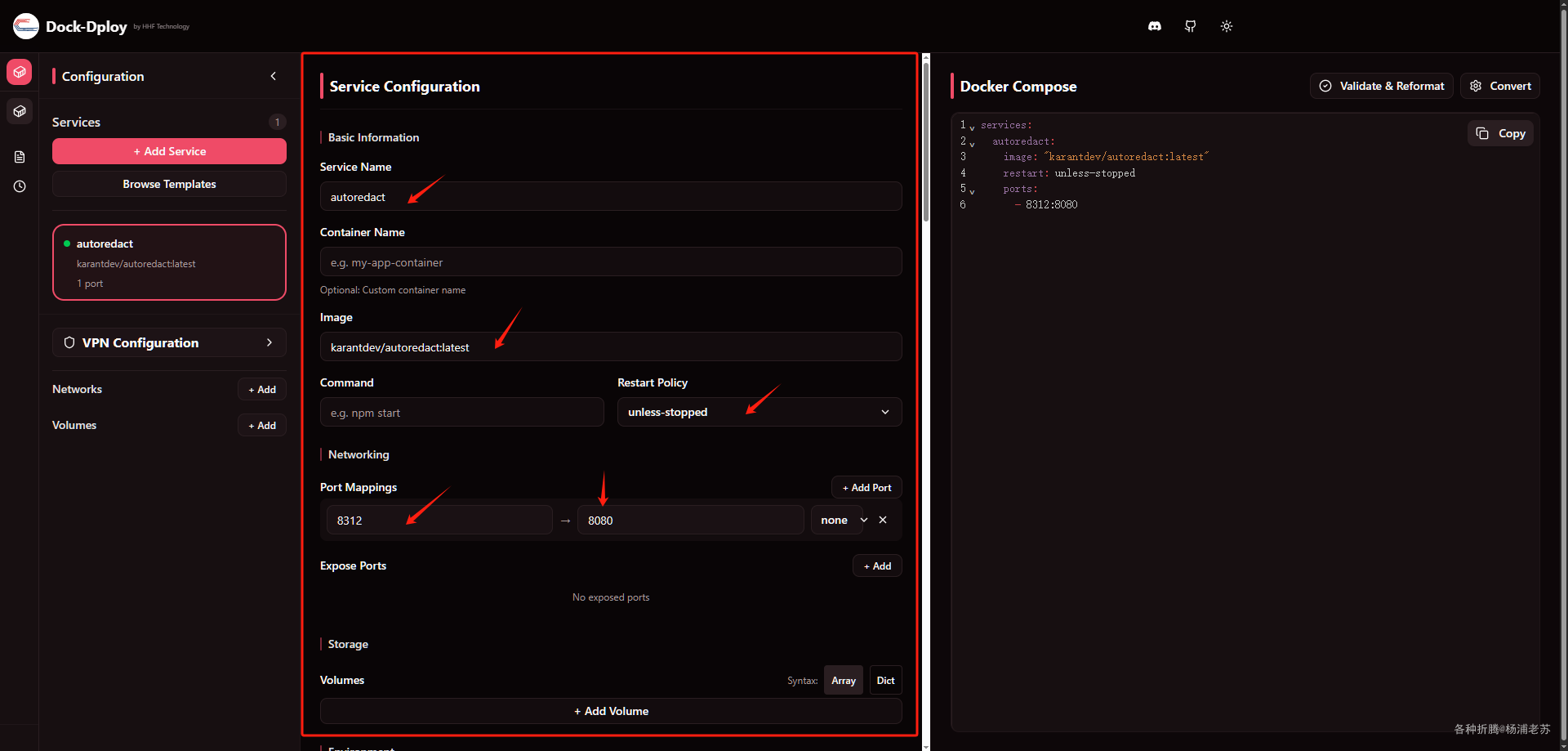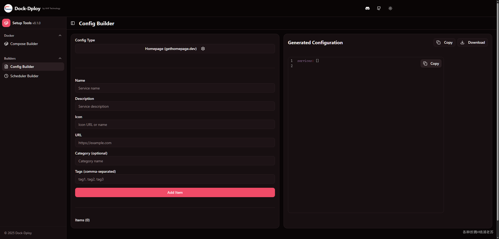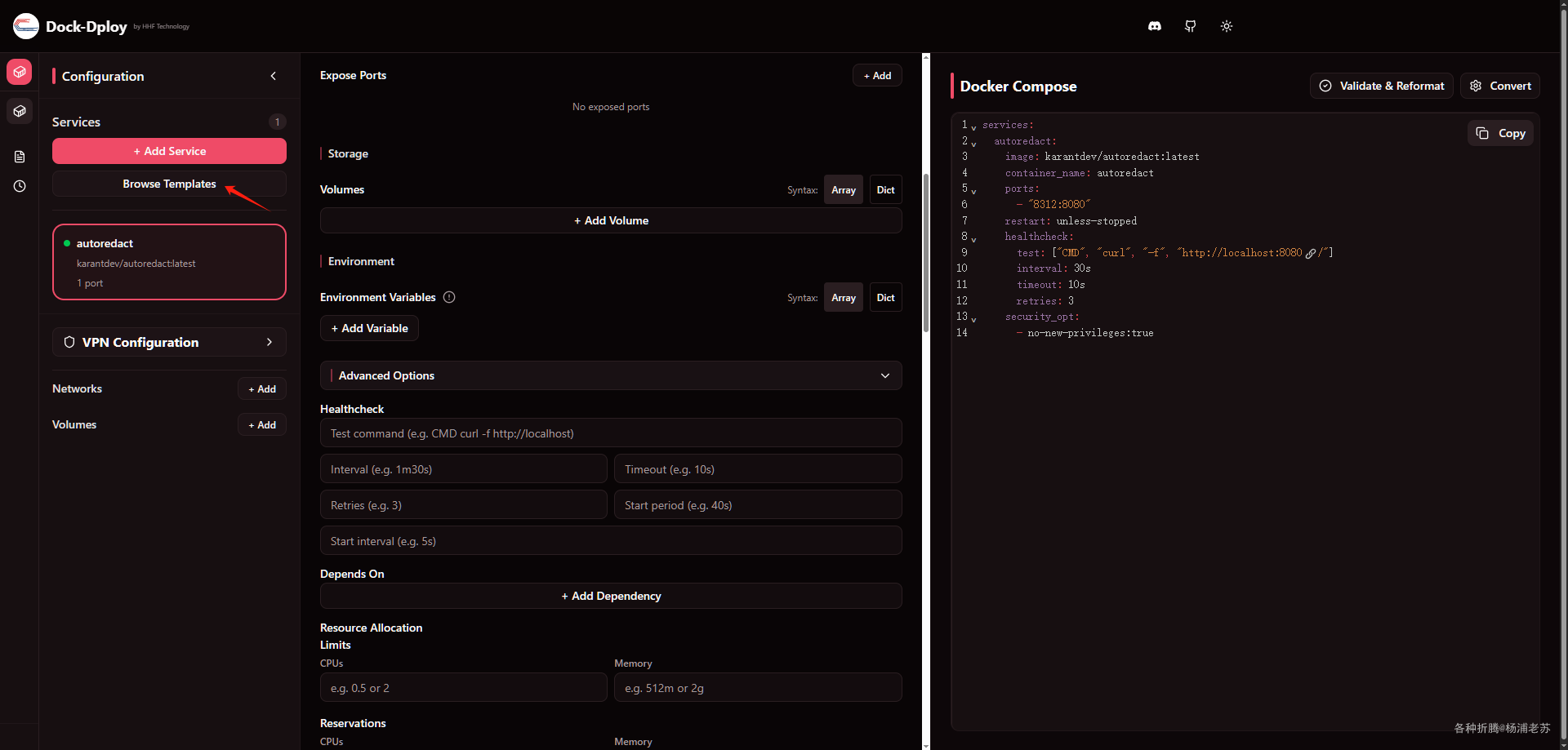 Dock-Dploy是一个基于web的工具,专为构建、管理和转换Docker Compose文件、配置文件和调度程序而设计。它提供了直观的界面,让用户可以轻松创建和配置Docker服务。