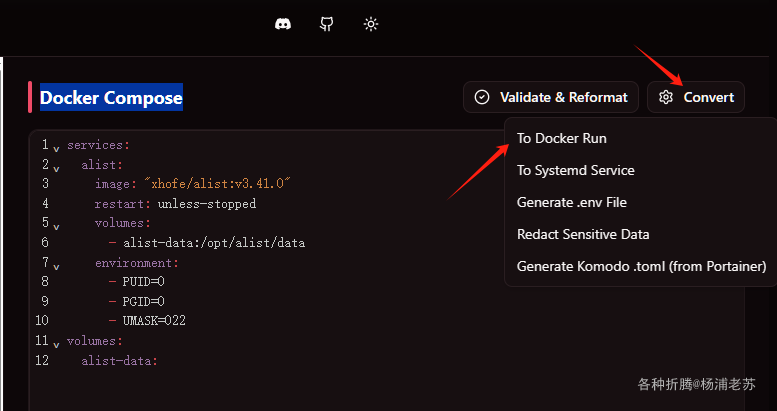 Docker Compose文件转换为多种格式,包括Docker Run命令和Systemd服务文件。