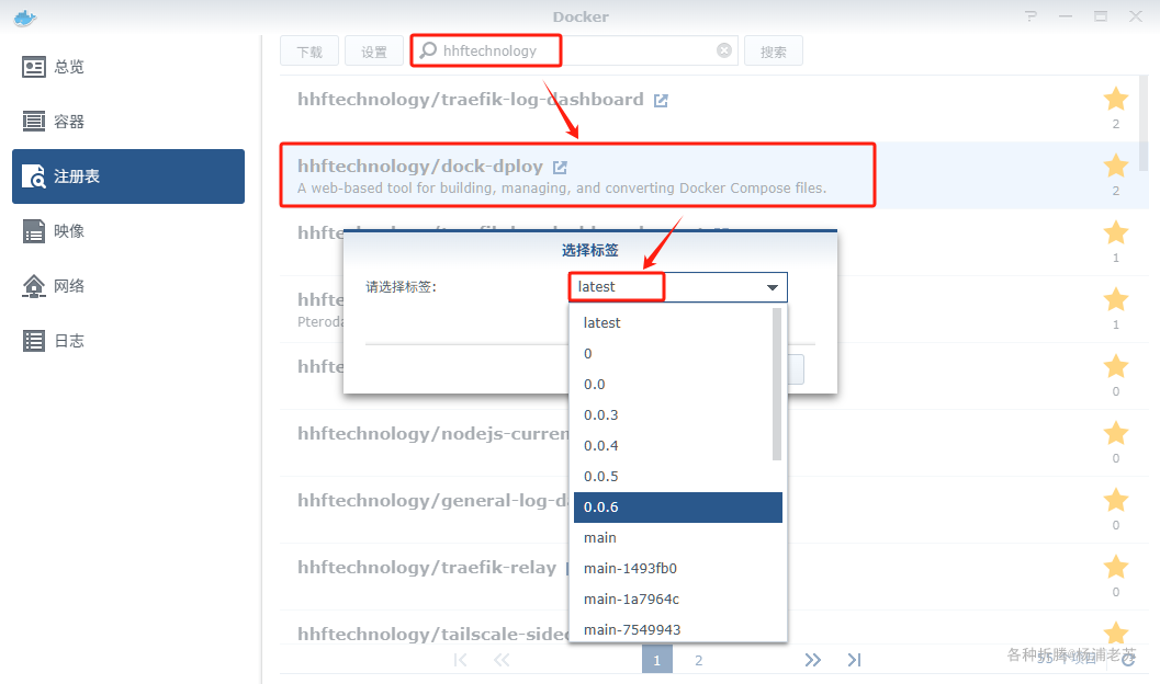 在注册表中搜索 hhftechnology ,选择第二个 hhftechnology/dock-dploy,版本选择 latest。