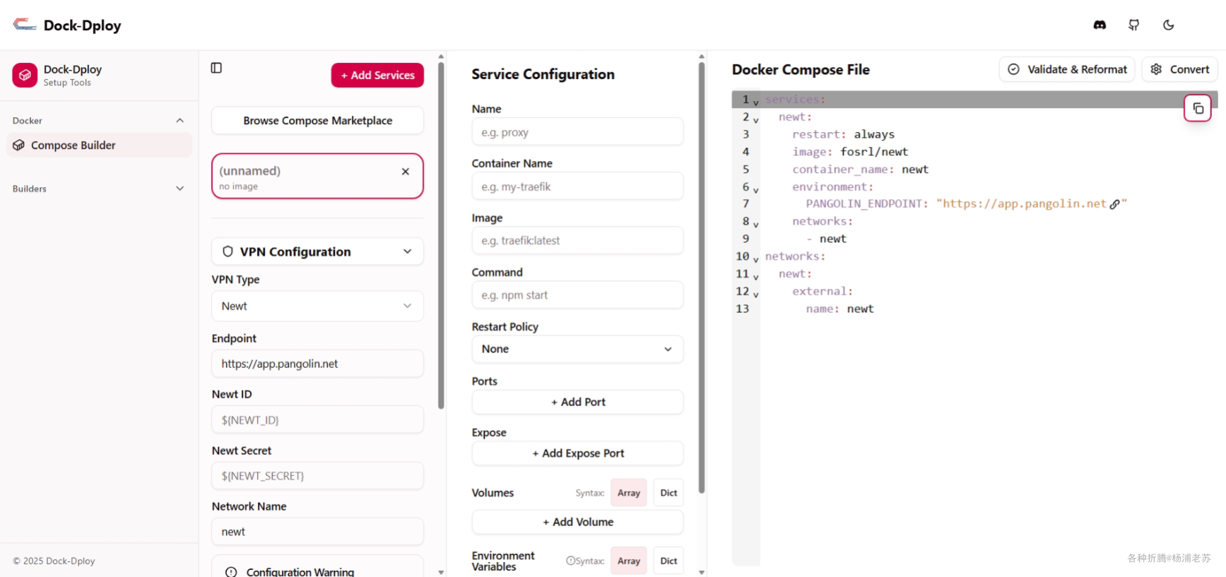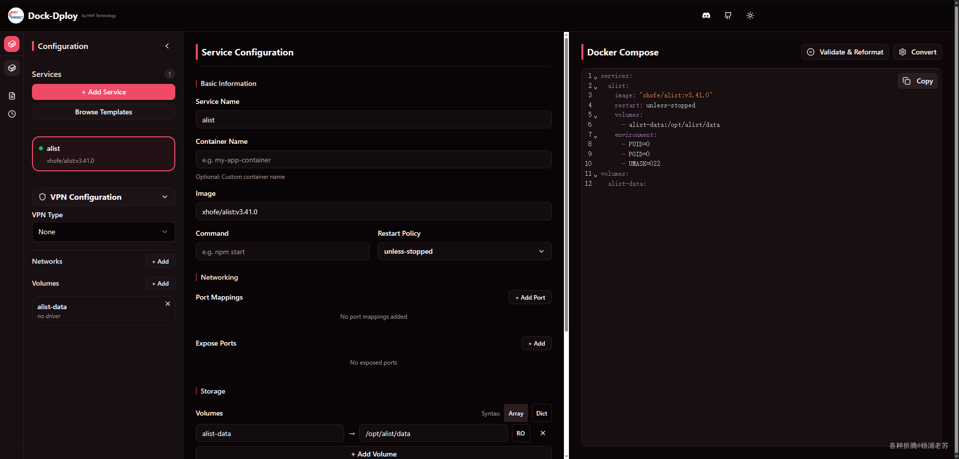 UI来创建和配置Docker服务。 - YAML 验证 :实时验证和格式化