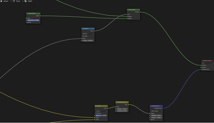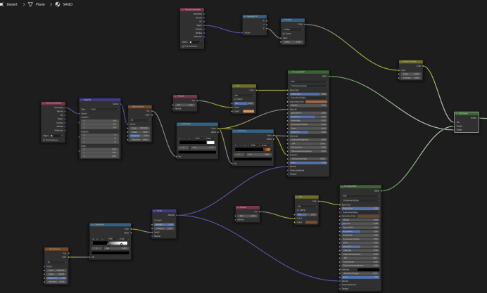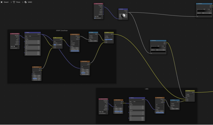 沙漠其实只是一个平面,上面加了非常复杂的位移纹理和一些阴影技巧:我最初主要遵循Martin Klekner的技术,然后添加节点和纹理,以实现与我为系列制作的其他环境更有机的效果。比如,我想画一个看起来更少尘土、更像岩石的沙漠,就像海水最近稍微干涸了,而那个地区变成沙漠才过去几年。