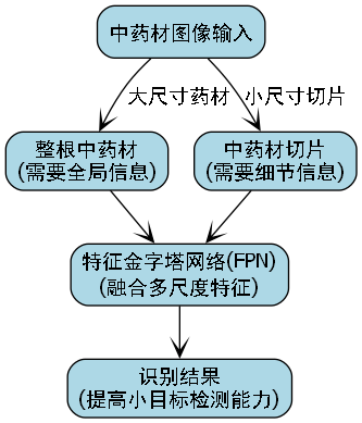 在中药材图像识别中,不同大小的中药材需要不同尺度的特征。例如,对于整根的中药材,需要更多的全局信息;而对于切片的中药材,则需要更多的细节信息。FPN能够有效地融合这些不同尺度的特征,提高模型对小目标的检测能力。