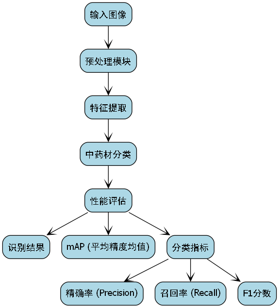在中药材图像识别任务中,我们采用多种指标评估模型性能,包括精确率(Precision)、召回率(Recall)、F1分数和平均精度均值(mAP)。