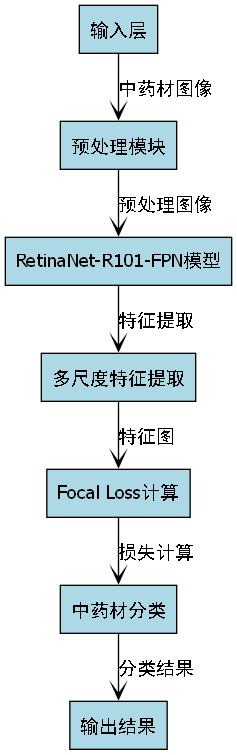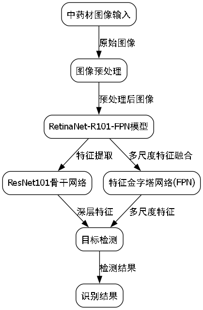 RetinaNet是一种单阶段目标检测算法,通过引入Focal Loss解决了类别不平衡问题。在中药材识别任务中,我们采用ResNet101作为骨干网络,结合特征金字塔网络(FPN)构建多尺度特征提取器。