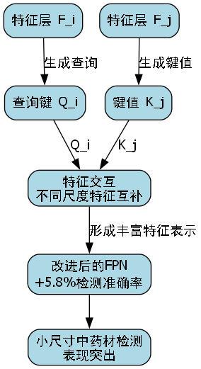 其中,Q_i和K_j分别是F_i和F_j的查询键值,d_k是特征维度。通过这种交互,不同尺度的特征能够相互补充,形成更加丰富的中药材特征表示。经过优化,改进后的FPN在中药材数据集上的检测准确率相比原始FPN提升了约5.8%,特别是在小尺寸中药材的检测上表现更为突出。🌟