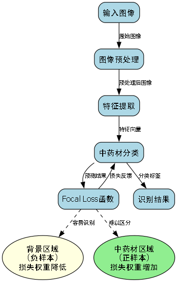 在中药材图像识别任务中,背景区域通常远大于中药材区域,导致类别严重不平衡。传统的交叉熵损失函数在这种情况下表现不佳,因为它会对简单样本(背景)给予过多的关注。