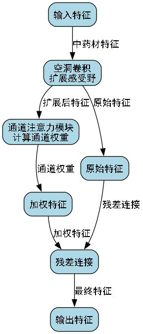 中药材的识别不仅需要关注整体形状,还需要关注局部纹理和细节特征。MFEM通过引入空洞卷积(Dilated Convolution)和通道注意力机制(Channel Attention Mechanism),增强特征表示能力。空洞卷积能够在保持感受野的同时,减少计算量和参数量;通道注意力机制则能够自动学习不同通道的重要性,增强对中药材关键特征的响应。