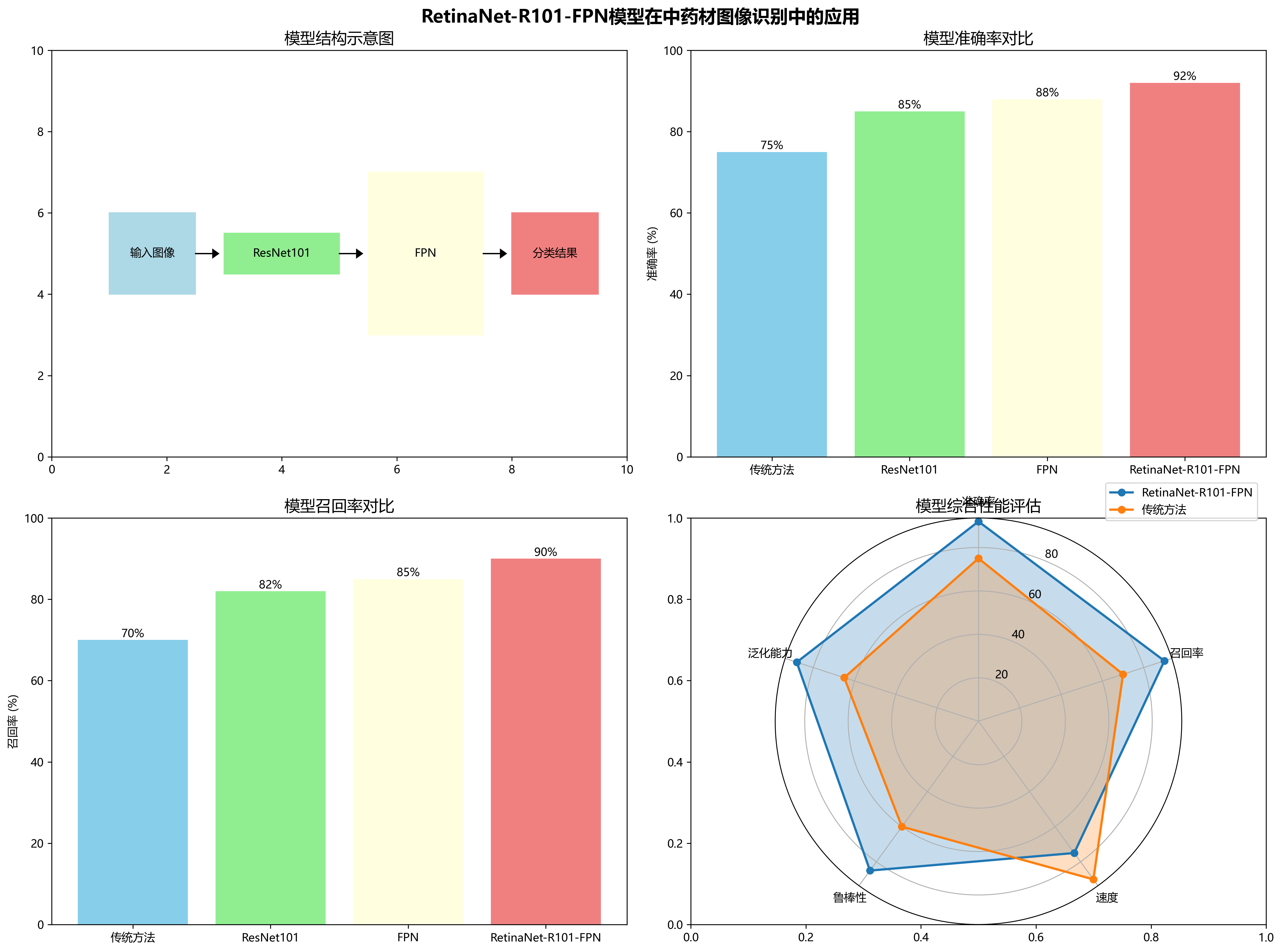 RetinaNet-R101-FPN模型在中药材图像识别任务中表现出色,其多尺度特征表示和Focal Loss设计特别适合中药材图像的特点。未来工作包括: