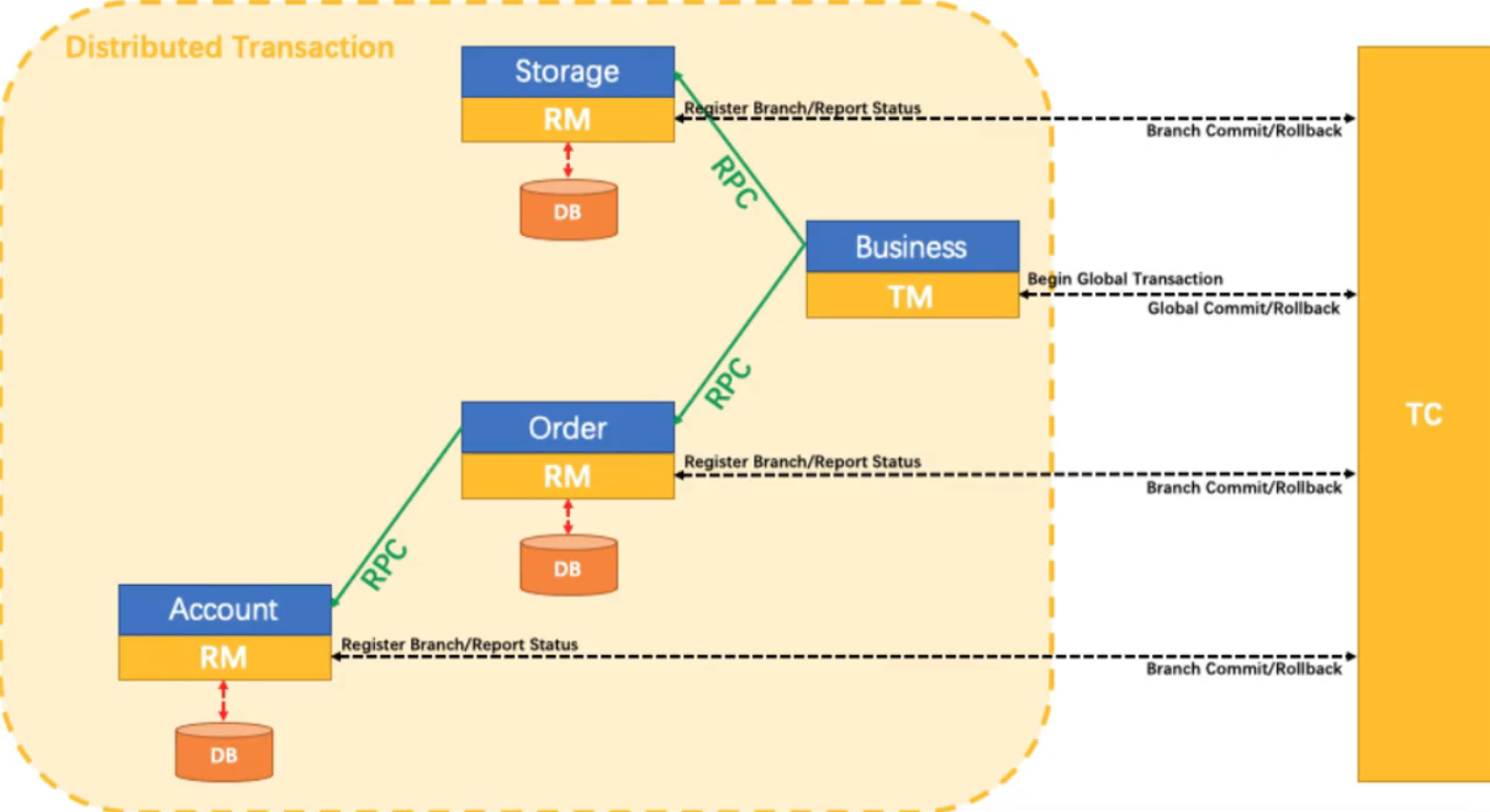 TC(Transaction Coordinator)事务协调者:维护全局和分支事务的状态,驱动全局事务提交或回滚。TM(Transaction Manager)事务管理器:定义全局事务的范围:开始全局事务、提交或回滚全局事务。RM(Resource Manager)资源管理器:管理分支事务处理的资源,与TC交谈以注册分支事务和报告分支事务的状态,并驱动分支事务提交或回滚。
