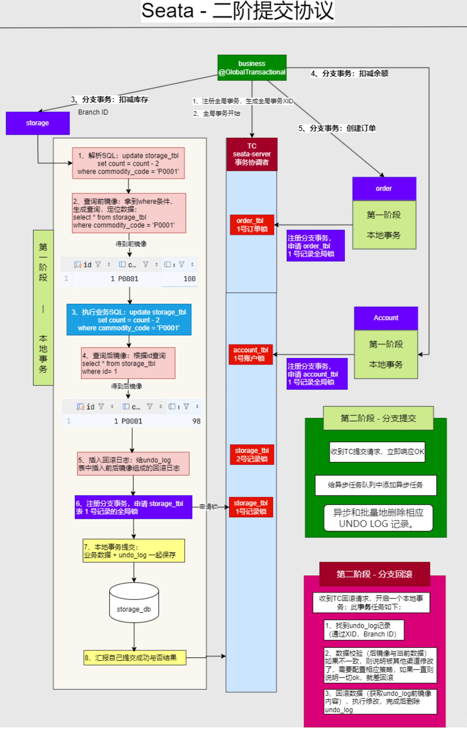一阶段:业务数据和回滚日志记录在同一个本地事务中提交,释放本地锁和连接资源。
