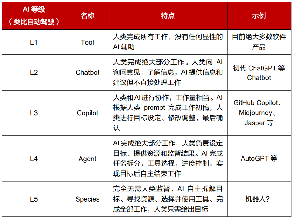 将 AI 和人类协作的程度类比自动驾驶的不同阶段: