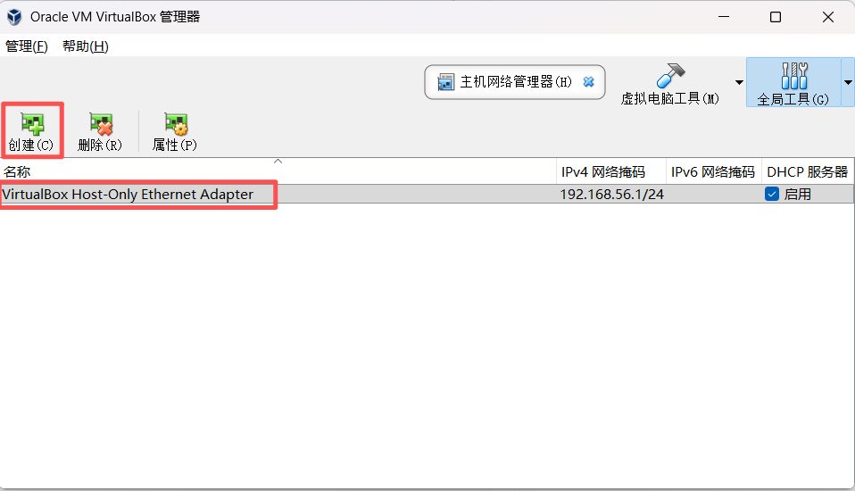 打开oracle vm virtualbox------>管理------>主机网络管理------>点击"创建",生成VirtualBox Host-Only Ethernet Adapter 虚拟仅主机网络适配器。