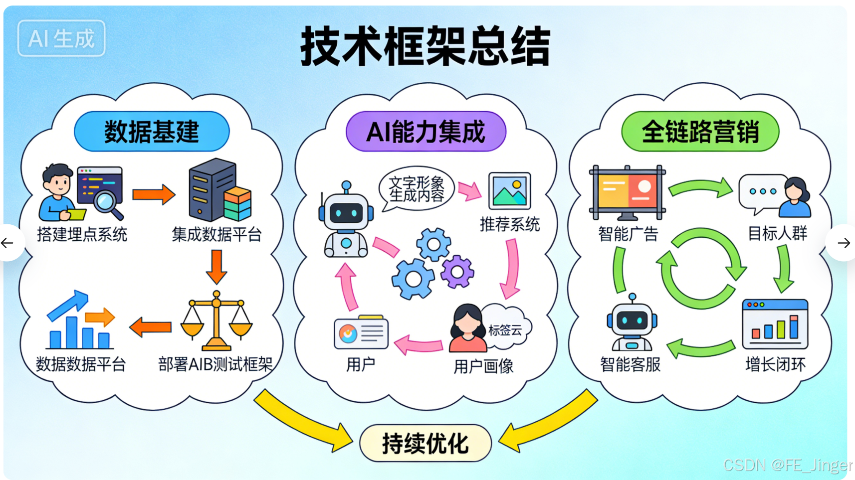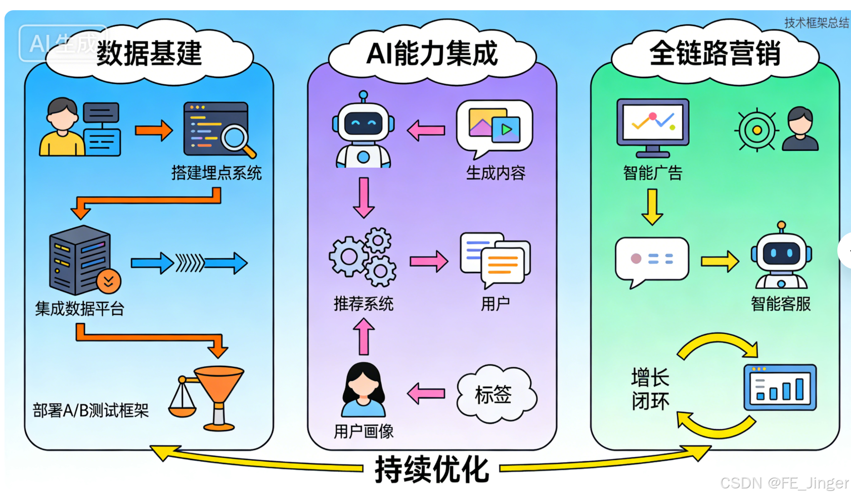前端是营销的「用户触点+数据入口」------通过埋点收集用户行为,集成AI能力实现个性化体验,再用A/B测试验证效果,最终形成「数据→AI→营销→反馈」的闭环。