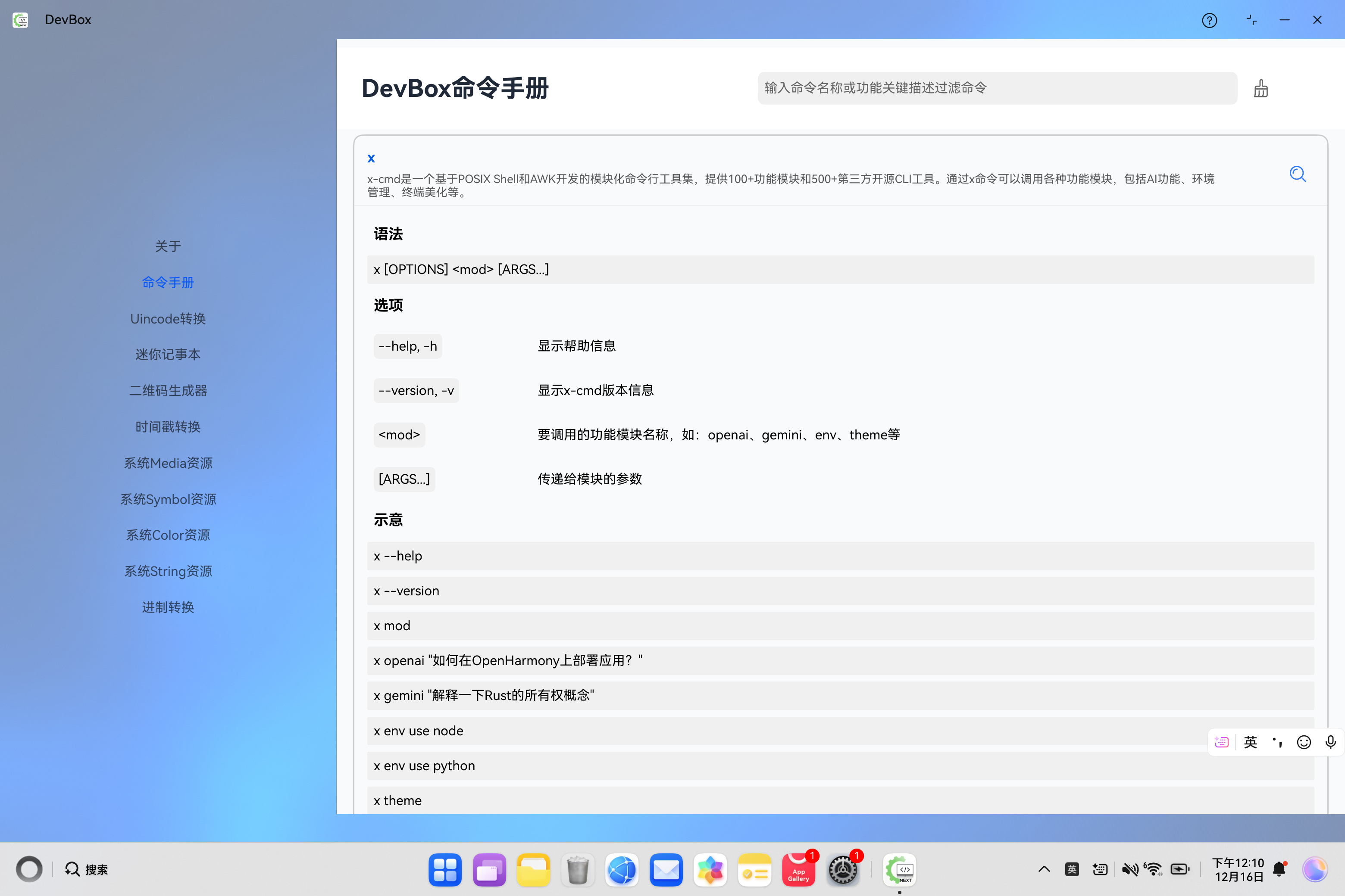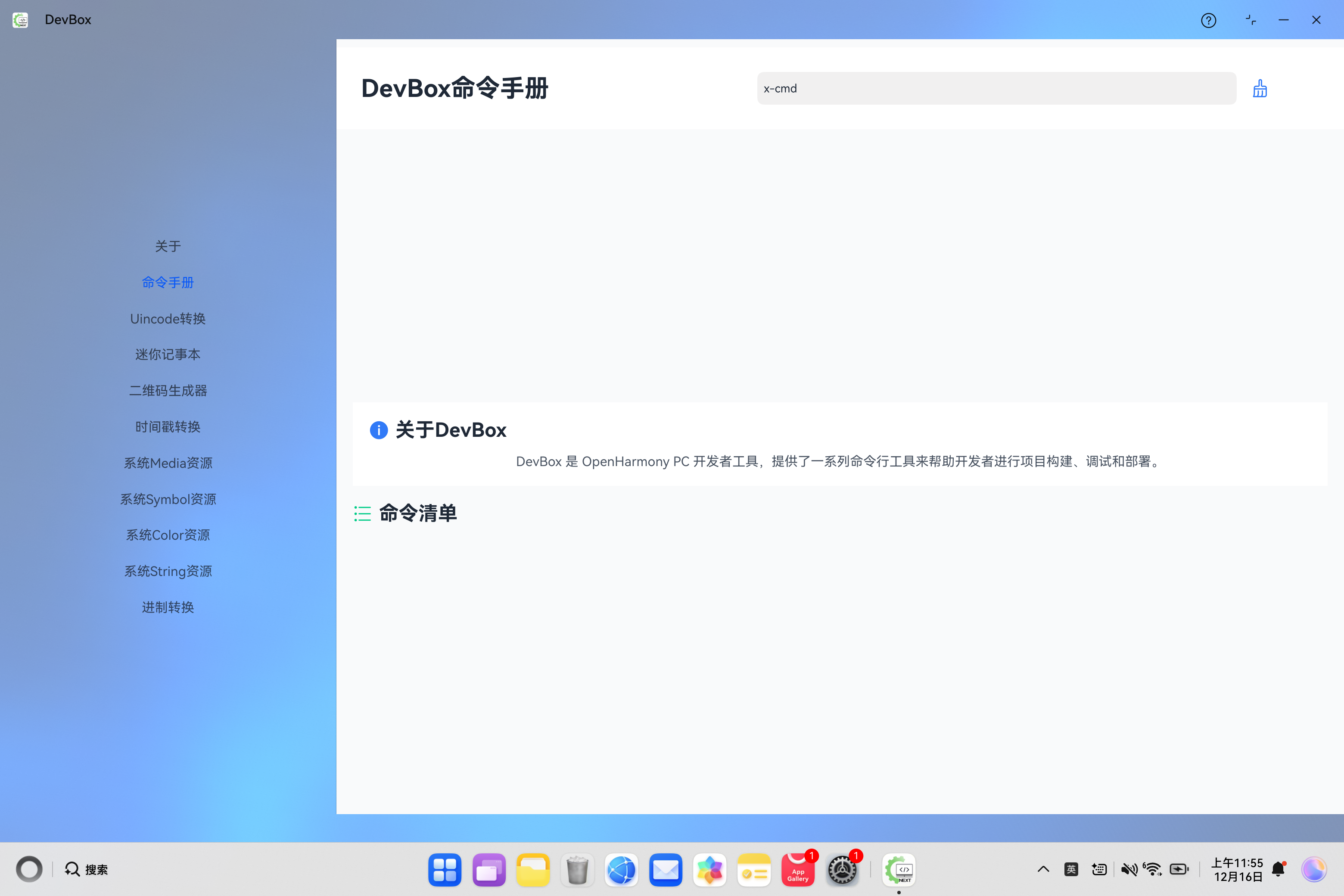 通过DevBox工具查找未具备x-cmd工具能力,将x-cmd工具适配到鸿蒙PC(OpenHarmony PC)平台,实现: