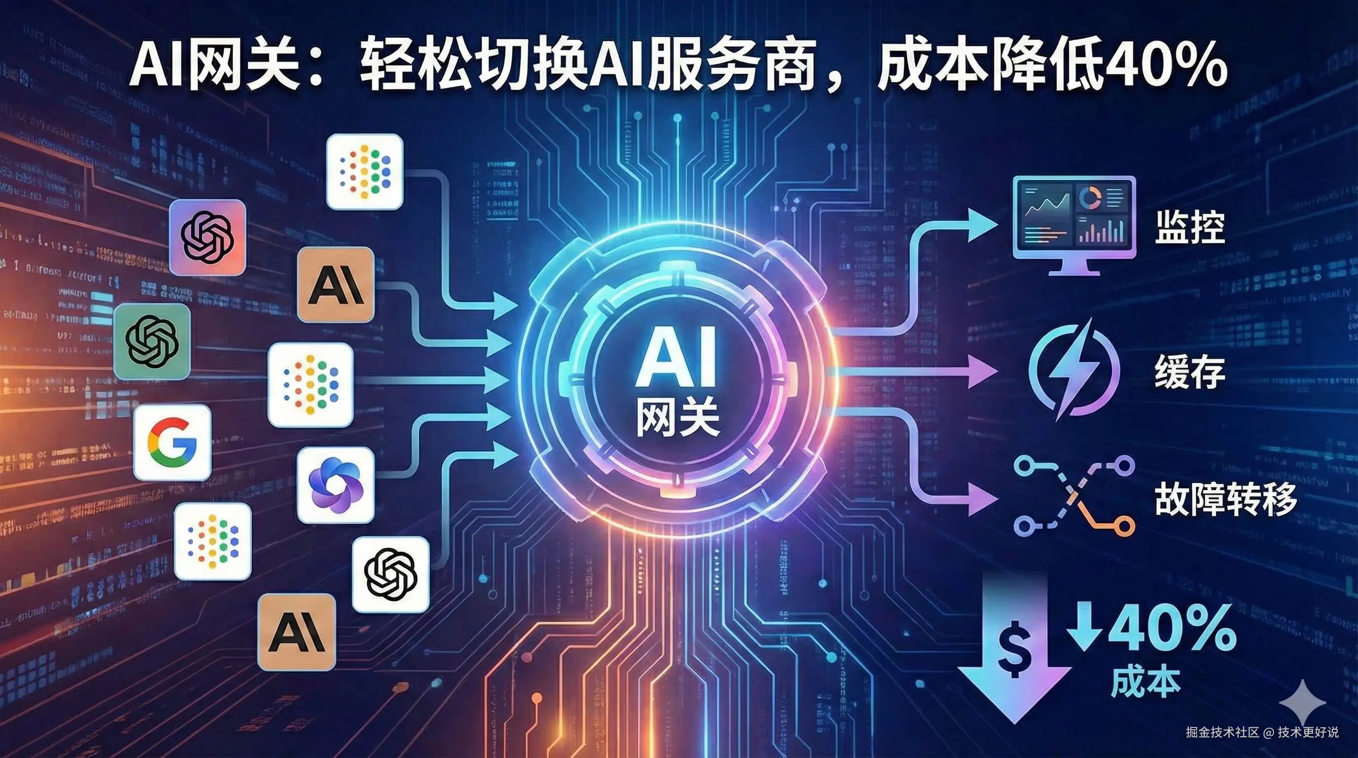 凌晨两点,你被电话吵醒,客户说AI功能挂了。打开监控一看,OpenAI又双叒限流了。你赶紧打开代码,把所有openai.chat.completions.create改成Claude的API,结果发现Claude的请求格式完全不一样,messages要改成anthropic.messages.create,参数结构也不对...改到三点半终于上线,累得要死。 第二天早上,老板发来账单截图:"这个月AI费用怎么从500美元飙到8000美元了?!"你一脸懵,根本不知道钱都花哪了,哪个团队用得最多,有多少是重复请求...完全一团乱麻。 说实话,这种痛苦经历,只要做过AI应用的人都懂。多个AI服务商切来切去太麻烦,成本失控心里慌,服务挂了业务就炸,想想都头疼。 其实,你只需要一个AI Gateway,就能彻底解决这些问题。改一行代码,OpenAI、Claude、Gemini随便切;自动故障转移,主模型挂了秒切备用;智能缓存加监控,成本直接降40%。今天这篇文章,我手把手教你10分钟搭建自己的AI Gateway,从此告别半夜改代码的噩梦。
