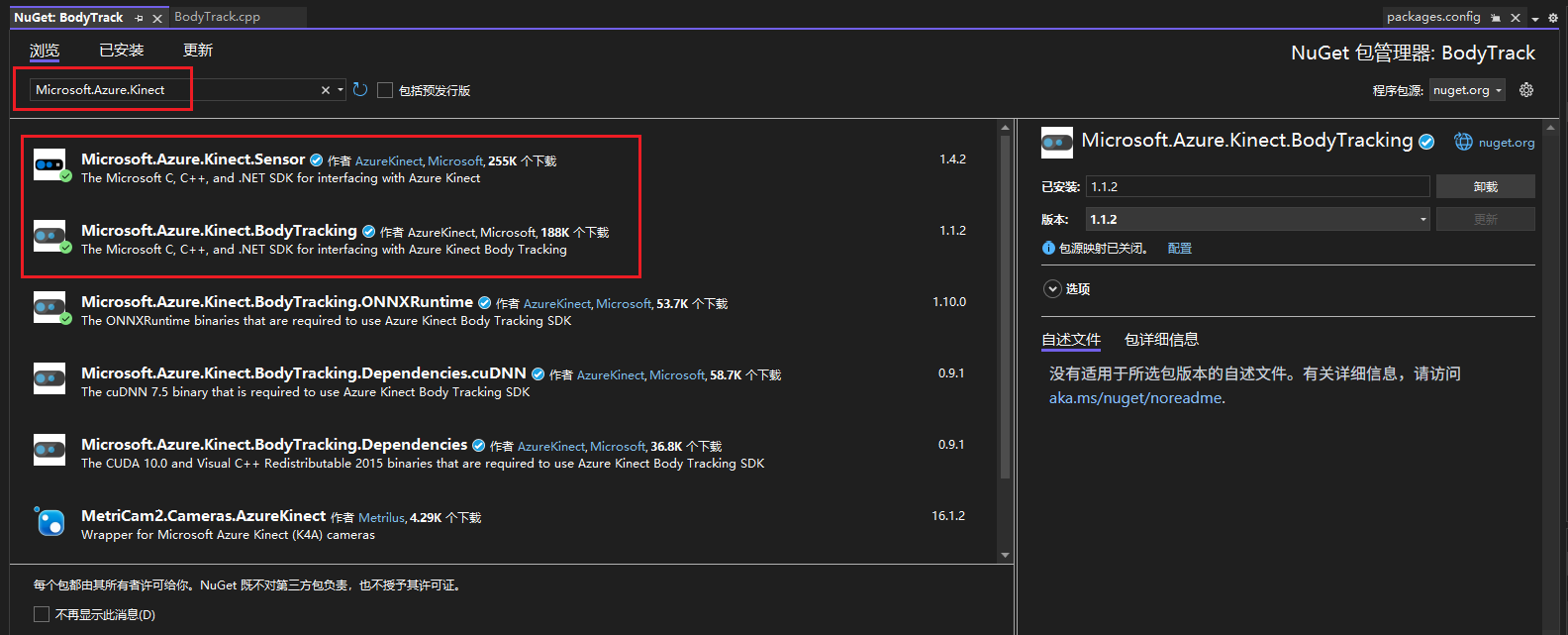 Microsoft.Azure.Kinect.Sensor包用来获取传感器数据;Microsoft.Azure.Kinect.BodyTracking包用来获取人体骨架关节,如果不做人体追踪,只安装第一个就行。