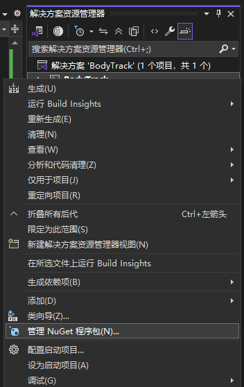 官网的示例可以直接跑,我们先来创建一个c++控制台工程,我用的是 visual studio 2022。在解决方案管理器中右键项目名,点击 管理 NuGet 程序包。
