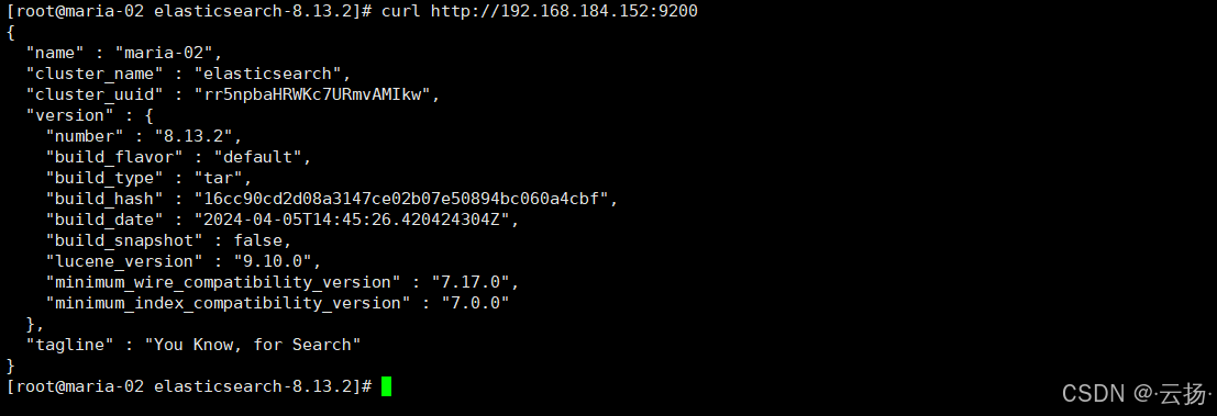 curl http://192.168.184.152:9200(9200是ES HTTP端口)访问,返回节点信息即表示正常。
