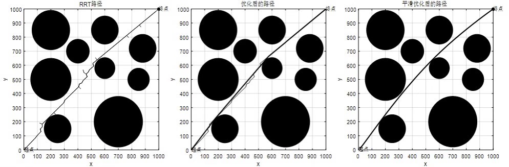 传统RRT需要约1200节点才能找到路径,改进算法仅需400节点左右。路径长度从原始78.2米优化至72.5米,平滑后进一步缩短到69.3米。