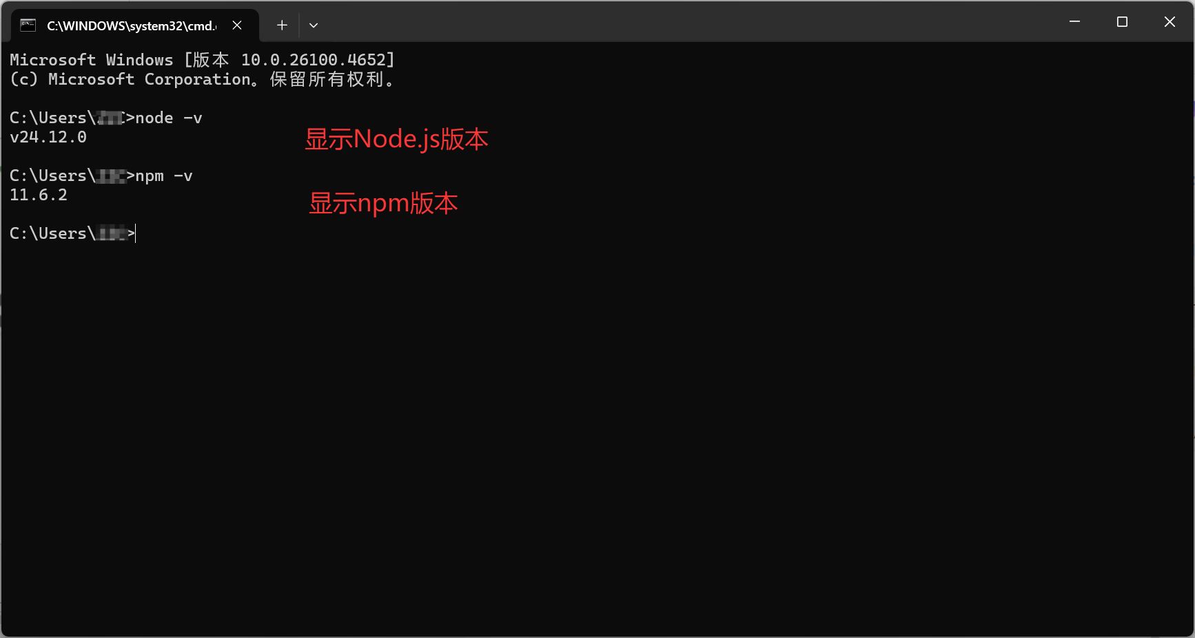 node -v回车,再输入:npm -v回车