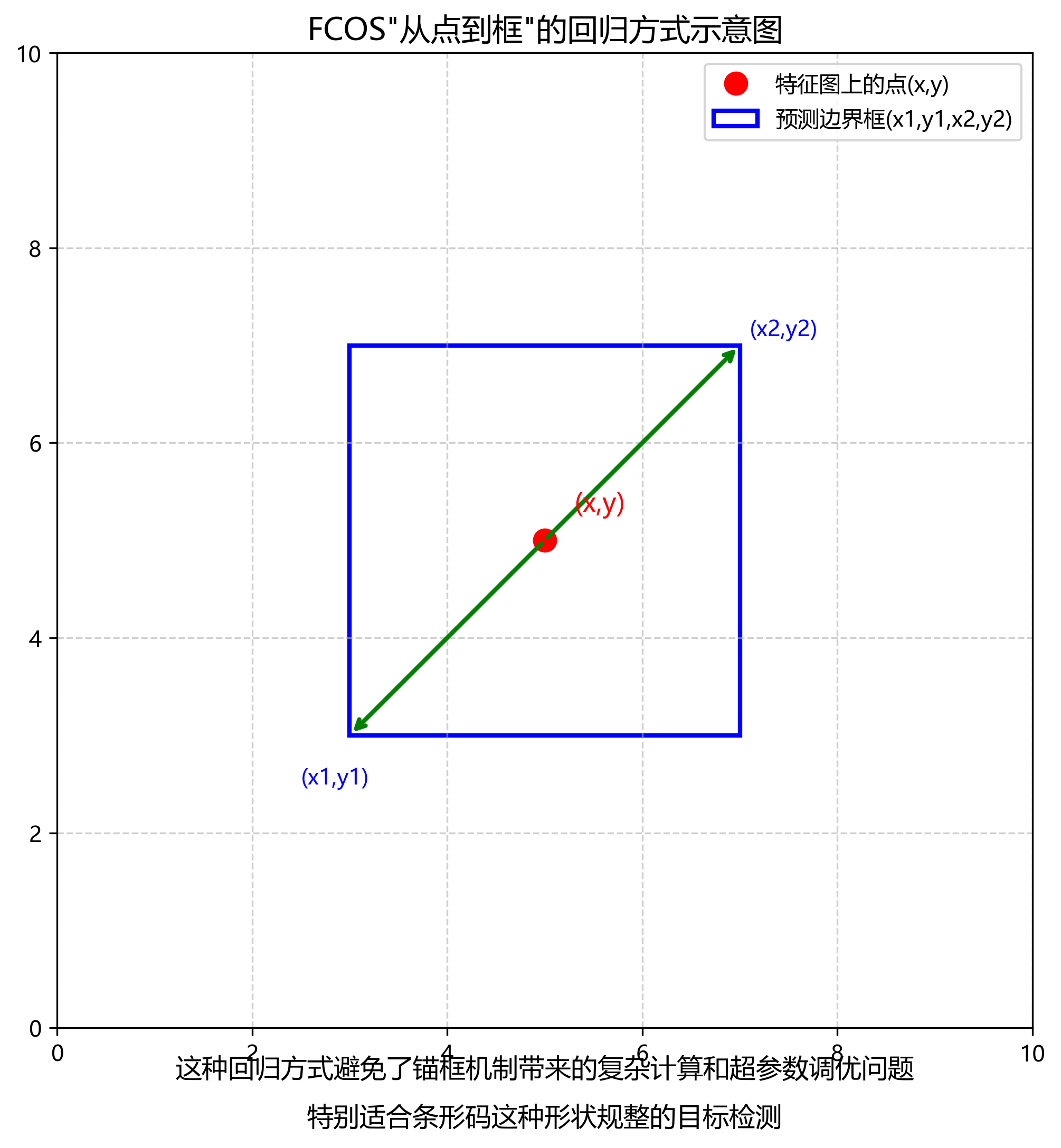 其中,(x,y)为特征图上的点坐标,(x₁,y₁,x₂,y₂)为预测的边界框坐标。这种"从点到框"的回归方式,避免了锚框机制带来的复杂计算和超参数调优问题,特别适合条形码这种形状规整的目标检测。与锚框方法需要预设不同长宽比的锚框不同,FCOS可以自适应地检测任意形状的目标,对于条形码这种长宽比固定的目标,反而能获得更精确的定位效果。