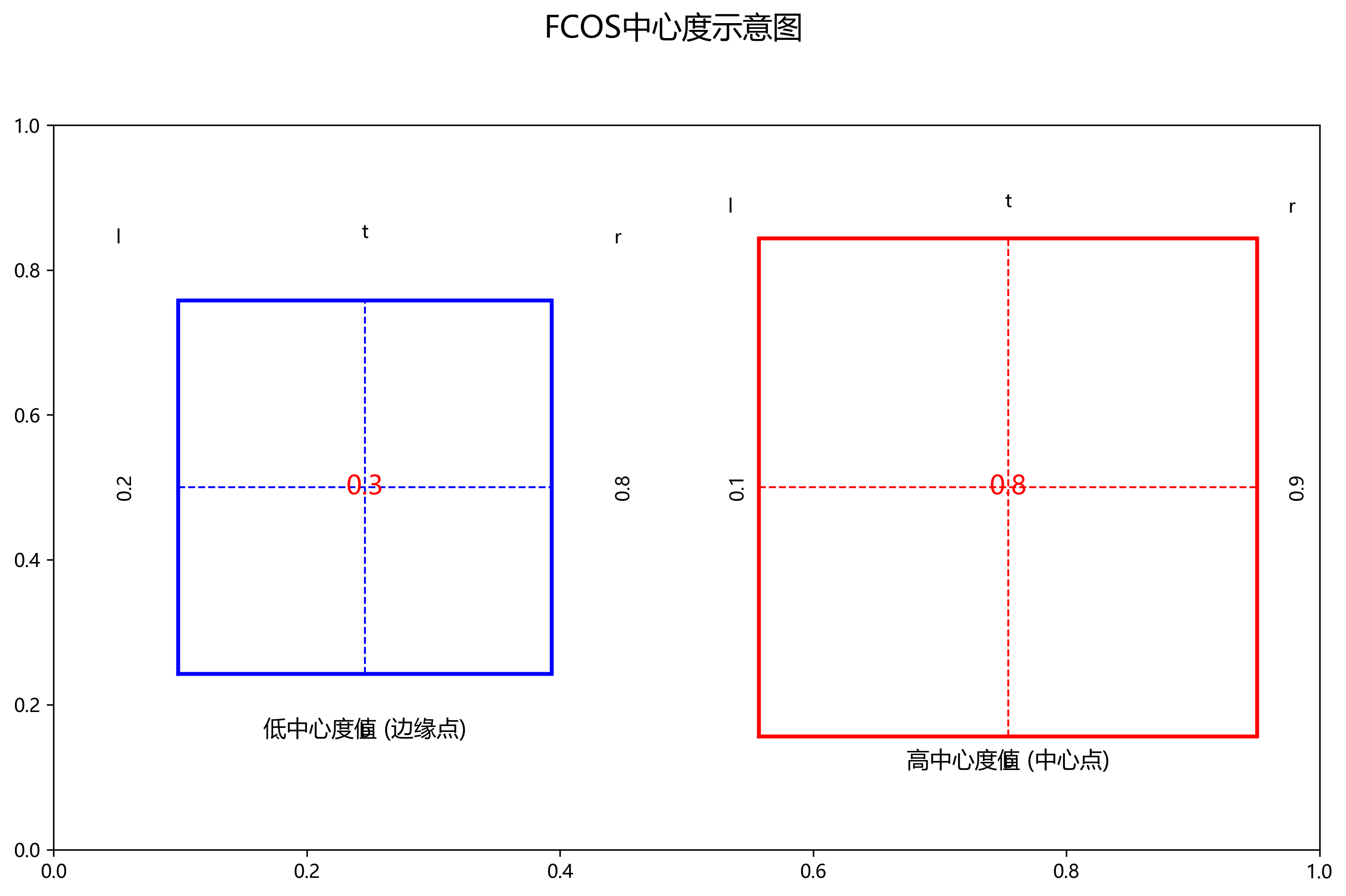 其中,lₘₐₓ = max(l, r),tₘₐₓ = max(t, b)。中心度值越接近1,表示该点越可能是目标的中心点;反之,则可能是边缘点。通过设置中心度阈值,FCOS可以有效过滤掉低质量的预测,提高检测精度。