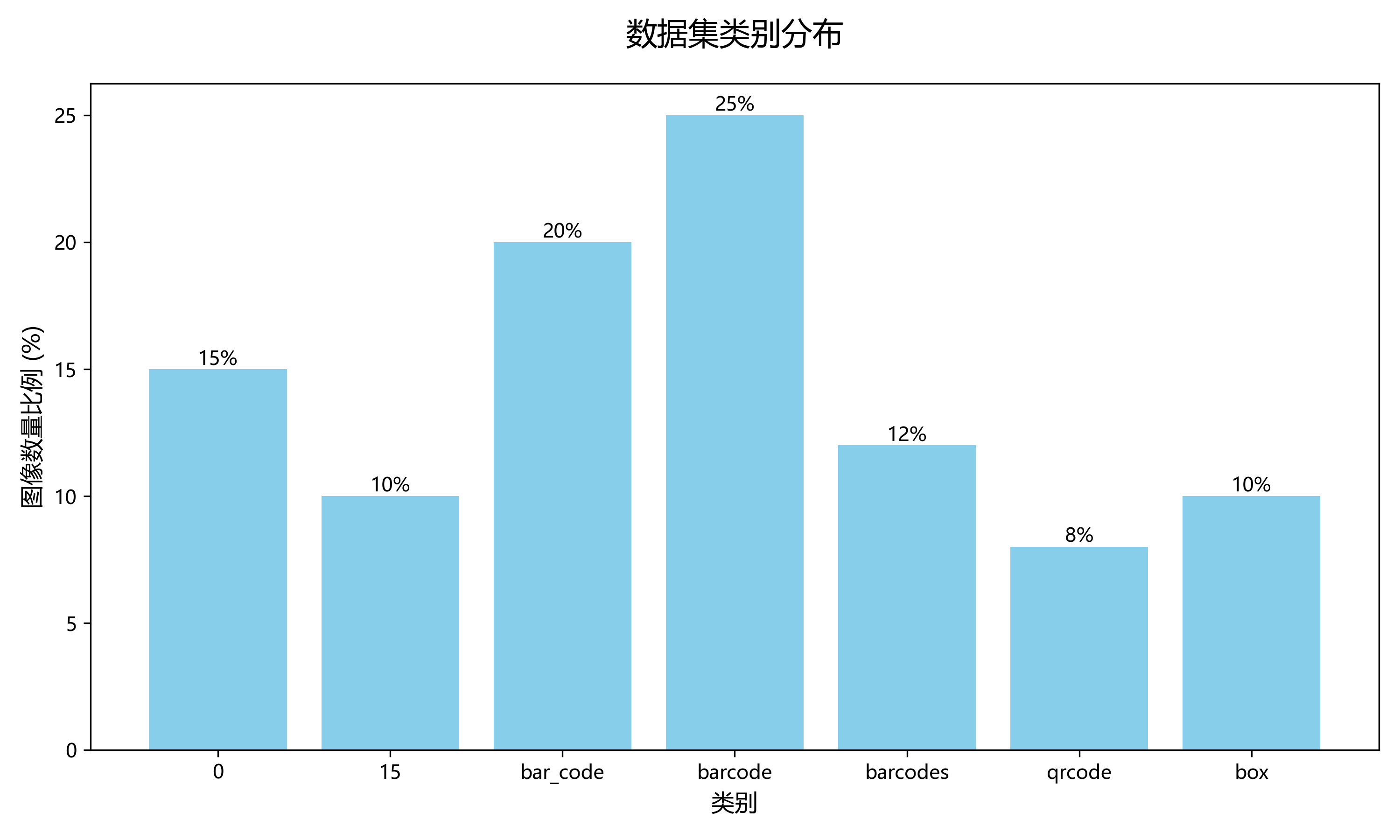 本数据集是一个用于条形码识别与定位的计算机视觉数据集,采用YOLOv8格式标注,包含6295张图像。数据集提供了7个类别,分别为'0'、'15'、'bar_code'、'barcode'、'barcodes'、'qrcode'和'box',涵盖了多种条形码和二维码类型。在数据预处理阶段,所有图像均经过了像素数据自动定向(剥离EXIF方向信息)、拉伸至640x640尺寸、灰度化处理以及通过对比度拉伸进行的自动对比度调整。为增强数据集的多样性,对每张源图像生成了3个增强版本,增强方法包括:50%概率的水平翻转、四种90度旋转(无旋转、顺时针、逆时针、上下颠倒)的等概率选择、0至42%的随机裁剪、-45°至+45°的水平与垂直随机剪切、-25%至+25%的随机亮度调整、0至2.5像素的随机高斯模糊以及5%像素的椒盐噪声。对应的边界框也进行了相应的变换,包括-45°至+45°的随机旋转、-30°至+30°的水平与垂直随机剪切以及-50%至+50%的随机亮度调整。数据集采用CC BY 4.0许可协议,由qunshankj用户提供,并于2023年8月18日导出。该数据集适合用于训练和部署基于计算机视觉的条形码检测与识别模型,可广泛应用于物流、零售、仓储等需要自动识别条码的场景。