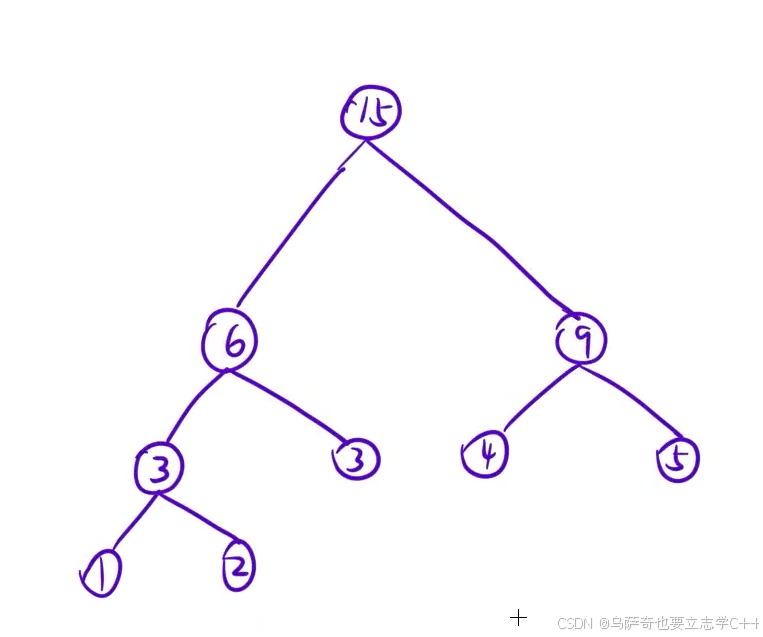 下面举个例子,把值分别为1,2,3,4,5的5个叶节点组成一个哈夫曼树,我们先把5个叶结点看成5棵独立的树,此时森林中有5棵树,首先把1,2结点合并形成一颗根为3的新树,此时森林中有4棵树,然后挑选森林中权值最小的两棵子树也就是3和3形成一棵新的子树,新子树的根节点为6,此时森林中有三棵树,依次重复上述步骤形成最后的哈夫曼树,如下图所示: