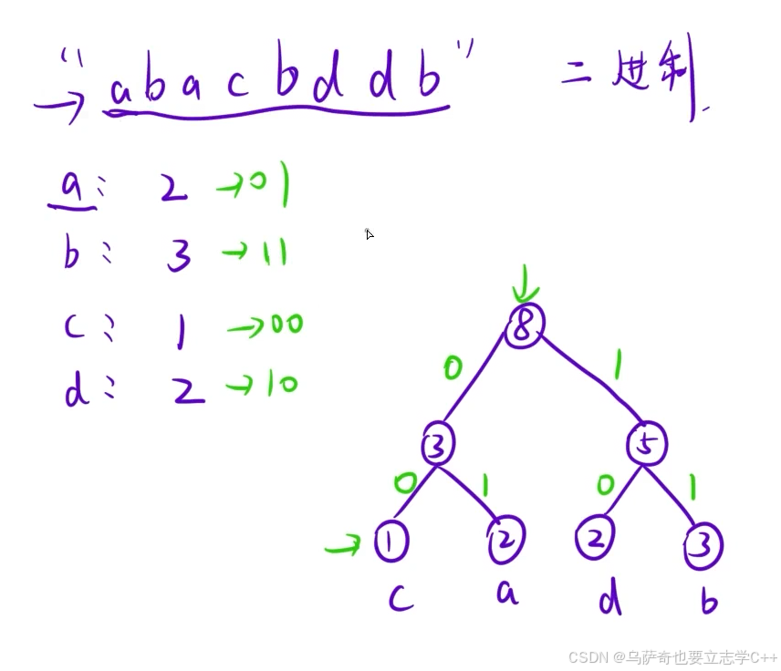 我们首先要知道编码是一种数据压缩的方式,比如上述的示例字符串:"abacbddb",字符串中的每一个字符都是8个比特位,如果我们采取编码操作,让每一个字符都用2个比特位表示的话,如 00 01 10 00 ,就可以进行数据压缩,哈夫曼编码就是一种压缩率最高的编码方式。