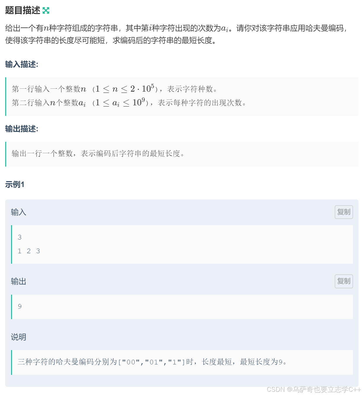 本题是哈夫曼编码的简单模板题,需要利用哈夫曼编码解题,哈夫曼编码需要构建哈夫曼树,而构建哈夫曼树需要用到哈夫曼算法,哈夫曼算法的原理是每次都需要取两个权值最小的根结点,所以需要构建一个小根堆存储每种字符出现的次数。求字符串最短长度本质就是求哈夫曼树的带权路径长度,所以每次取两个权值最小的根结点,并把它们出堆,根据计算带权路径长度规则,把它们的和加到ret中,然后把它们的和重新入堆。