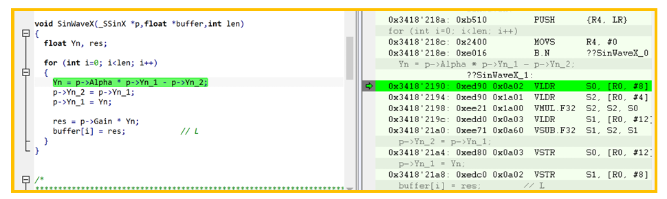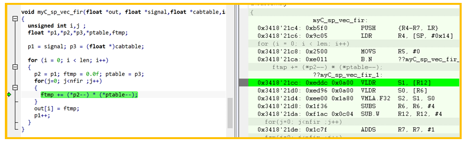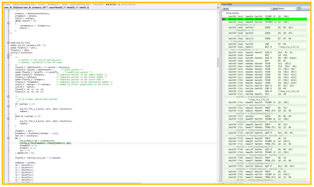 从右侧的汇编窗口可以看到使用了VLDRW.32, VMUL.F32, VFMA.F32等汇编指令,其中:
