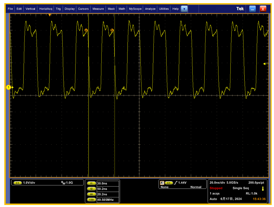 测试方法是将主频16分频后,通过PA8引脚输出出来,800M/16=50MHz,也就是说应当