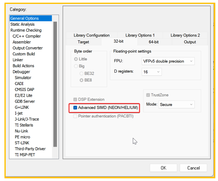 在IAR编译器中需要勾选上图的选项才可以使能Helium指令,如果是ARM编译器,需要