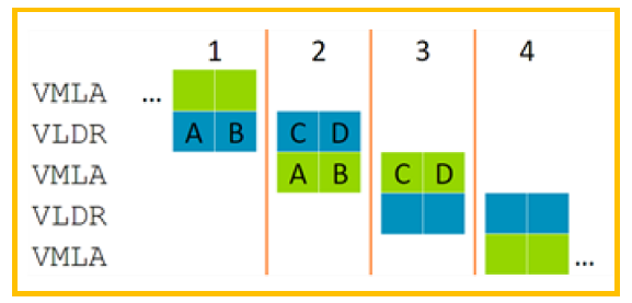 上图中 ,1,2,3,4分别为不同时钟周期,每个时钟周期可以处理两个beats数据,即64位, 在第二个时钟周期,由于VLDR指令和VMLA指令overlapping,即内核可以同时执行加载和 处理指令,如果指令的pipeline和调度被设计的很合理的话,性能会有非常大的提升。